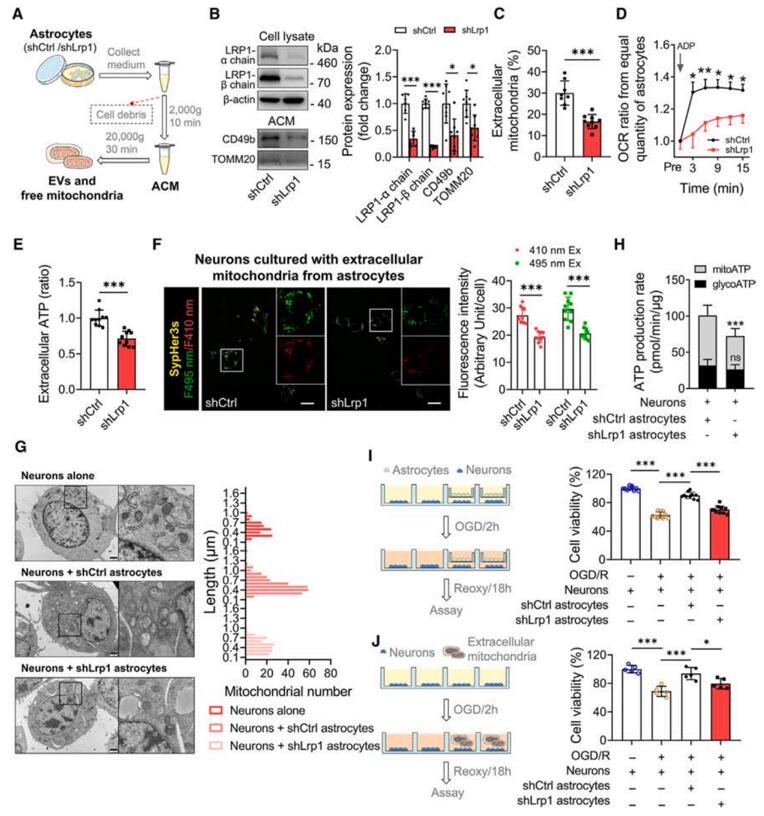 图1. LRP1促进星形胶质细胞向神经元转移线粒体