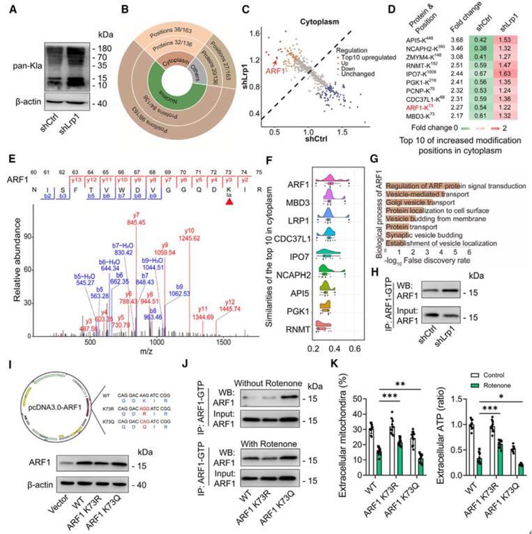 图4. ARF1-K73乳酸化抑制LRP1诱导的线粒体释放