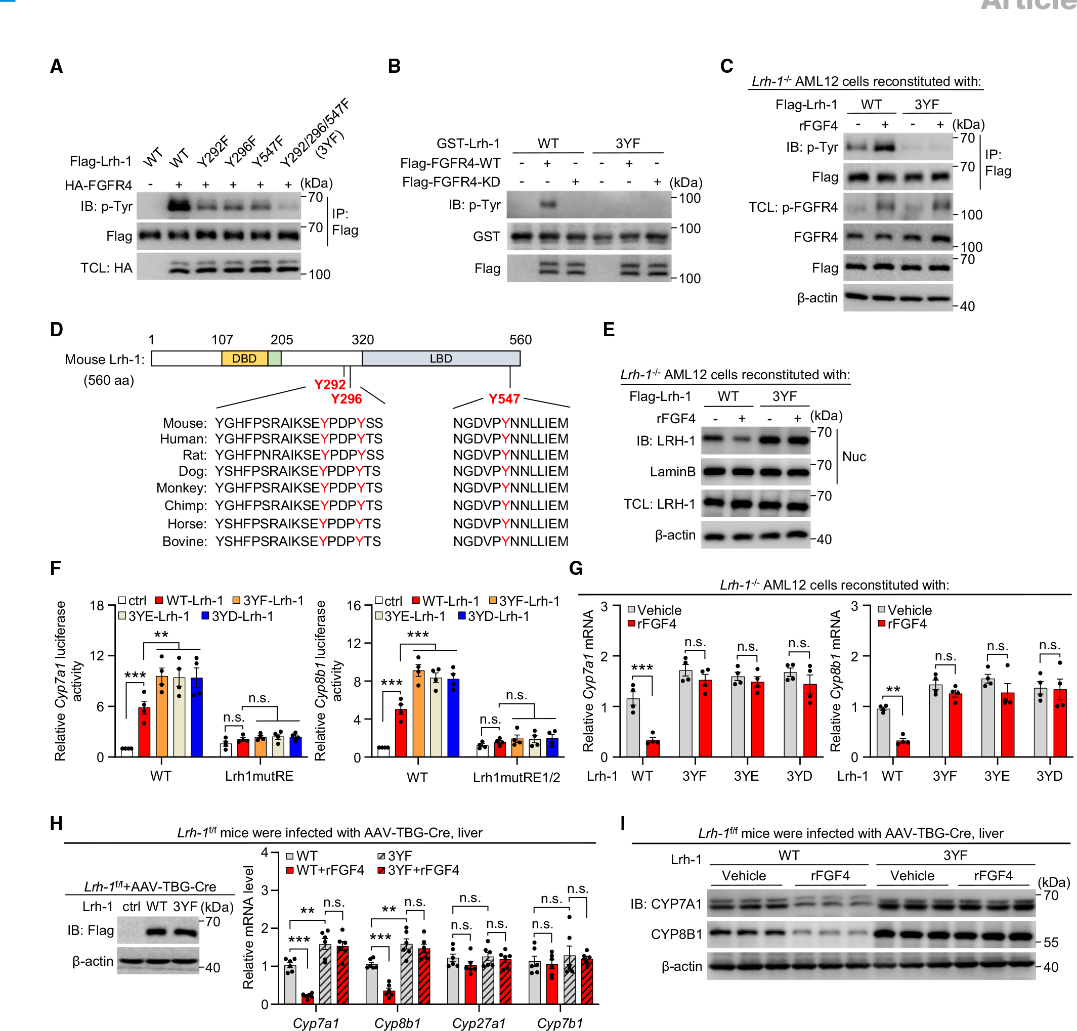 为了进一步了解LRH-1的作用机制,研究团队通过诱变分析和体外激酶试验研究其潜在的磷酸化位点,结果显示LRH-1的三个酪氨酸(Tyr292, Tyr296和Tyr547)是FGFR4的催化磷酸化的位点,将这三个位点突变为苯丙氨酸(3YF)或者其他氨基酸后(如谷氨酸和天冬氨酸)后能抑制rFGF/FGFR对LRH-1的磷酸化,降低LRH-1在细胞核的定位,抑制对Cyp7a1/Cyp8b1表达的下调效果。同样在动物实验中,LRH-1(3YF)突变能消除对Cyp7a1/Cyp8b1的抑制作用。综上所述,这些数据表明,FGF4介导的BA合成抑制依赖于LRH-1的酪氨酸磷酸化。