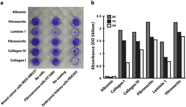 如图4所示,作者将乳腺癌MDA-MB 231(BC,灰色)、纤维肉瘤HT-1080(FS,黑色)和胚胎HEK-293肾脏(EK,白色)细胞在48孔板上以4×10^5个细胞/mL的密度附着于不同的ECM蛋白包被或未包被(对照,No coating)上30分钟,进行结晶紫染色后,使用酶标仪检测吸光度。根据颜色深浅或吸光度数值可判断Vitronectin对细胞的粘附抑制效果最弱,而Laminin 1显示出最强的粘附抑制能力[9]。