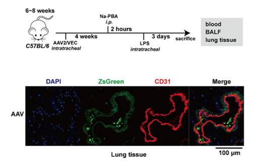 图13中,者利用气道给药方式将汉恒生物提供的腺相关病毒AAV-Vec-Tie,递送至肺内皮细胞(50μL/每只小鼠,1*10^12 VG/ml)。并在AAV病毒给药4周后,在靶细胞中检测到目的基因的表达[21]。