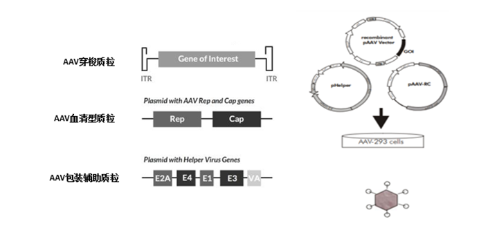 通过对AAV2 RC质粒进行改造,获得不同血清型的RC质粒。在包装病毒时,将RC质粒、腺病毒辅助质粒以及含有目的基因的AAV表达质粒一起转染293细胞,获得不同血清型的重组AAV病毒颗粒(rAAV),如图3所示。