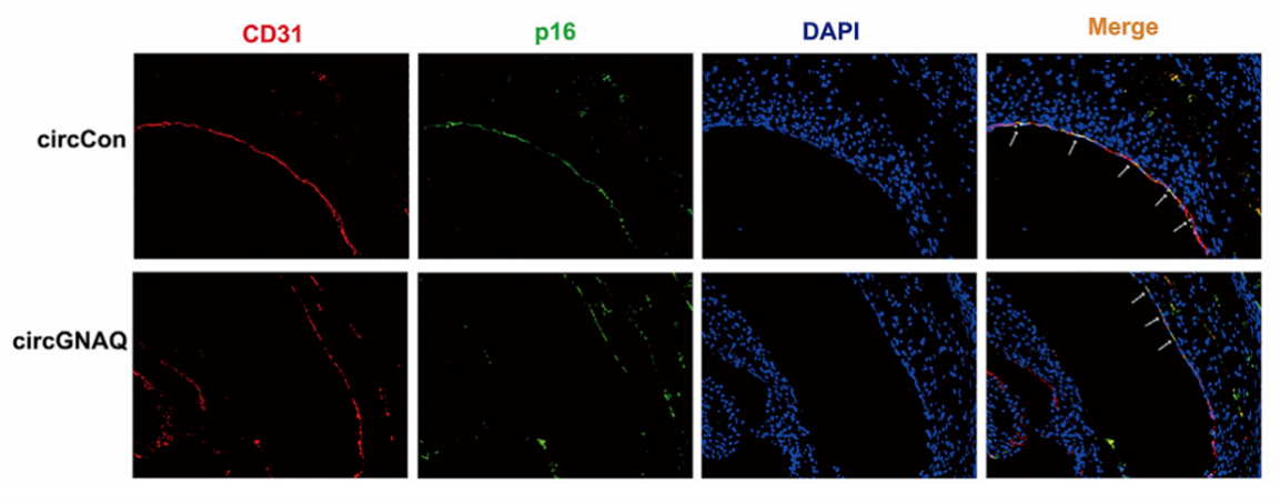 图9是作者使用汉恒生物公司构建的AAV-Tie2-circGNAQ病毒载体,通过尾静脉注射小鼠((1.6 X 10^11 vector genomes [vg]/mice),载体携带Tie2启动子,使得circGNAQ的表达仅限于内皮细胞。最终在小鼠主动脉内膜中检测到circGNAQ的表达量显著高于对照组[17]。