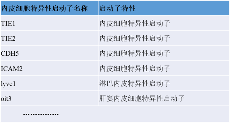 特异性血清型AAV可以实现组织或细胞特异性感染,然而利用特异性血清型所靶向的范围仍然较宽,如果要在某种特定内皮细胞上实现基因表达调控,仅使用不同的特异性血清型是难以实现的,而特异性启动子就可以提供更多选择(如表2所示)。因此,除了使用特异性血清型外,还可以利用特异性启动子来实现目的基因特异性表达的目的。