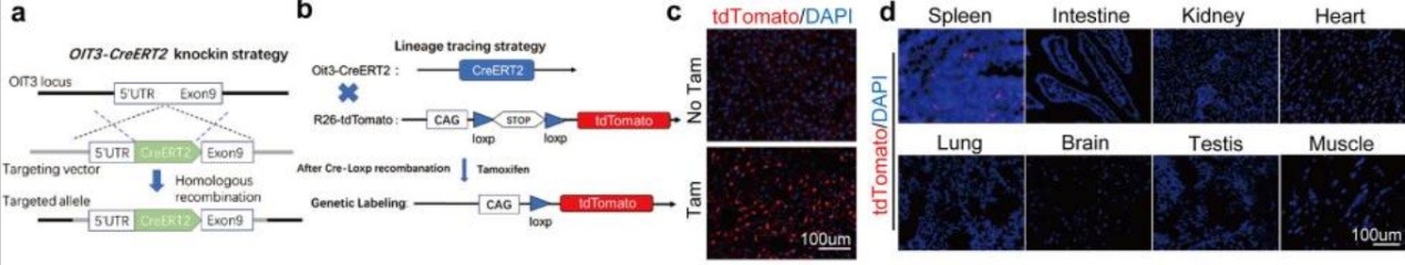 肝窦内皮细胞(Liver sinusoidal endothelial cells,LSECs)是位于肝窦内的高分化内皮细胞,占肝脏细胞20%左右,在调控肝再生、纤维化、脂肪变性等肝脏内各种病理生理过程中起着关键作用。人们已经意识到LSECs的重要作用,但特异性标识LSECs的Marker基因的缺乏,限制了对其分子特性和功能特征的研究。2023年,空军军医大学研究团队通过多种单细胞RNA测序分析发现Oit3是LSECs最特异的Marker,并且构建了Oit3驱动的CreERT2转基因小鼠,并与Rosa26-tdTomato报告小鼠杂交,获得了Oit3-CreERT2-tdTomato小鼠,当Cre酶被激活表达后,Oit3驱动的细胞就会标记为tdTomato,这为探索LSECs在生理和病理状态下的复杂功能和机制提供了可靠的方法[20]。