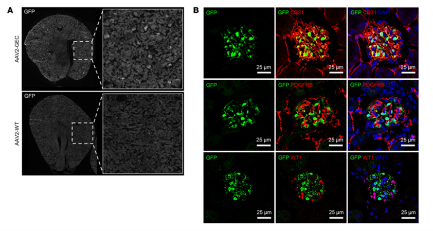图7展示的结果是研究人员开发的AAV-GEC血清型在静脉注射小鼠后,可以特异且高效地靶向肾小球内皮细胞,这为肾小球炎症的肾病治疗提供了可能[15]。