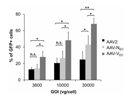 为了高效特异性靶向血管内皮细胞,研究人员构建了带内皮靶向肽VSSSTPR(“Vec”)突变型衣壳,以及之前报道的内皮靶向肽NNPLPQR(“Nec”)突变型衣壳以及野生型AAV2衣壳的腺相关病毒,分别体外感染人脐静脉内皮细胞(HUVEC),观察其对HUVEC细胞的感染效率。结果在不同梯度的GOL(genome-per-cell ratio)条件下,AAV-Vec感染HUVEC细胞的效率均明显高于AAV-Nec以及AAV2,显示了AAV-Vec具有良好的血管内皮细胞的特异性[16]。