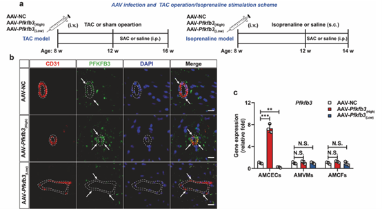图10作者使用汉恒生物公司构建的腺相关病毒AAV-Vec-Tie1-Pfkfb3和AAV-Vec-Tie1-mir30-Pfkfb3,通过尾静脉注射小鼠(100ul/每只小鼠),特异性地在小鼠心脏内皮细胞中实现Pfkfb3的过表达和敲低,并证明了心脏内皮细胞中Pfkfb3的异常表达参与了内皮细胞向肌细胞转化相关的心脏纤维化[18]。