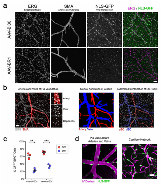 图6. AAV-BI30高效转导大脑动、静脉内皮细胞