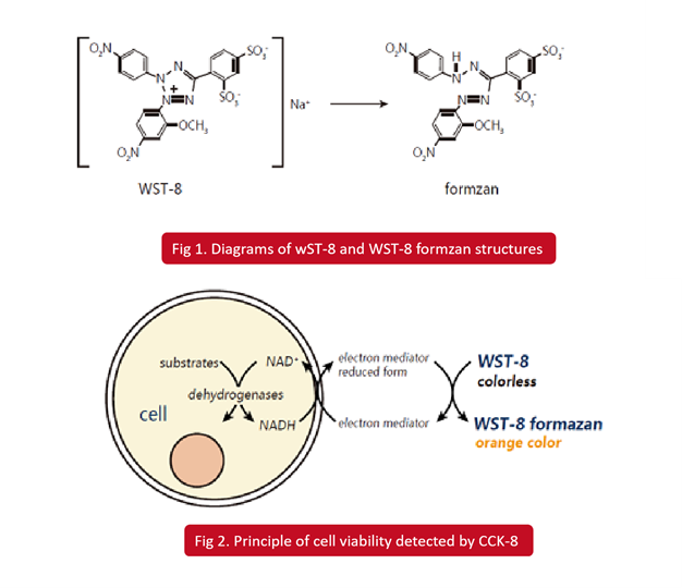 CCK-8 cell proliferation detection kit is a rapid sensitivity kit based on WST-8 (chemical name: 2-(2-methoxy-4-nitrophenyl)-3-(4-nitrophenyl)-5-(2, 4-disulfonyl benzene)), which is widely used in cell proliferation and cytotoxicity detection. The WST-8 is an upgrade of MTT and works as follows: In the presence of electron-coupled reagents, WST-8 can be reduced by the mitochondrial dehydrogenase to produce the highly water-soluble orange-yellow formazan (Figure 1-2), the color of which is proportional to the proliferation of the number of surviving cells and inversely proportional to cytotoxicity. OD values measured at 450 nm wavelength by enzyme-labeled apparatus can indirectly reflect the number of living cells. CCK-8 method is widely used, such as drug screening, cell proliferation assay, cytotoxicity assay, tumor drug susceptibility assay, and biological factor activity detection.